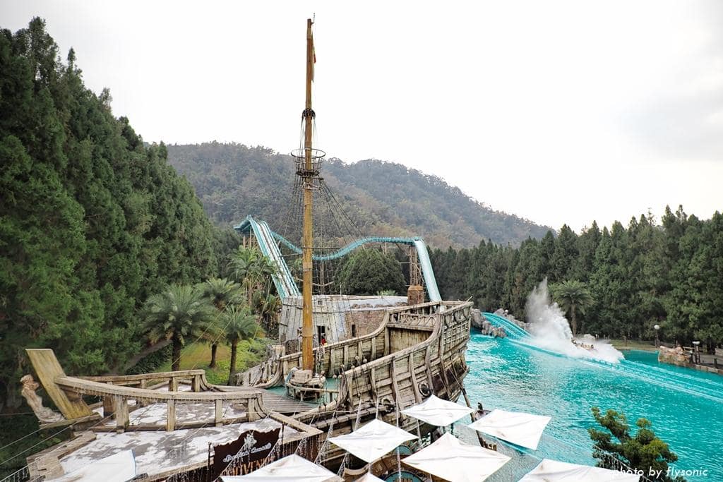 另一邊可以看到無敵艦隊的水道,以及一艘巨大的海盜船。船上還有一個人偶爬上爬下的,乍看之下還以為是真的人,兒子看得目不轉睛。