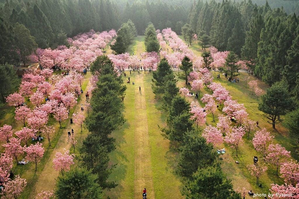 空中看櫻花大道的富士櫻盛開。