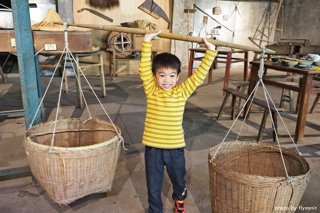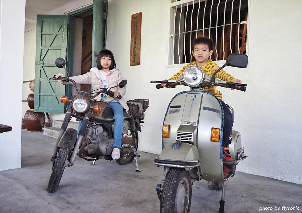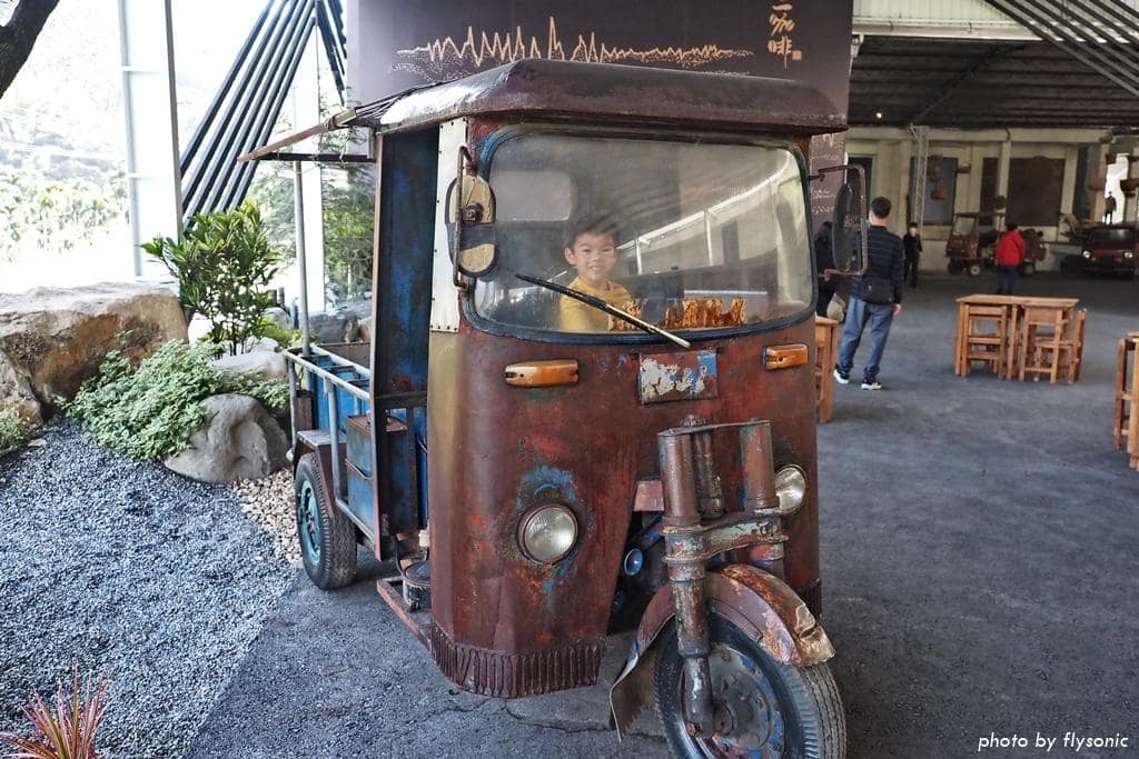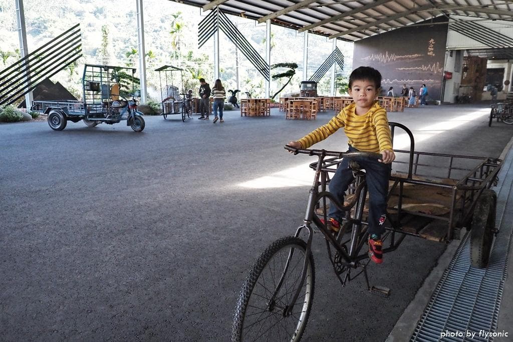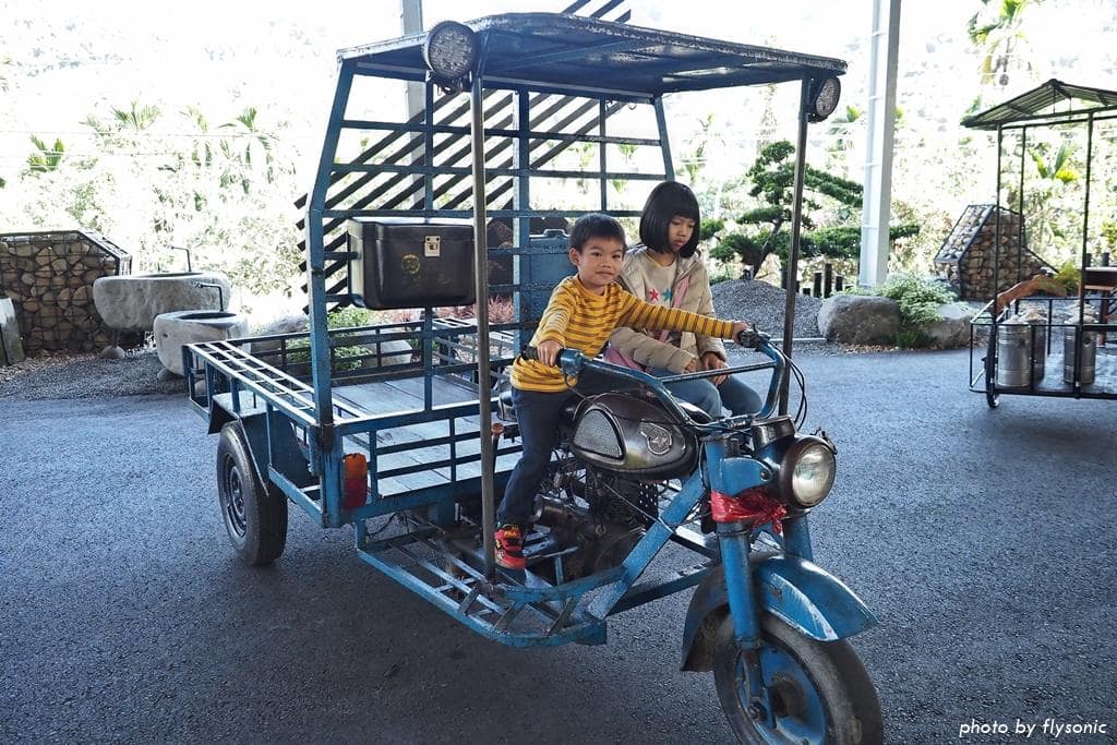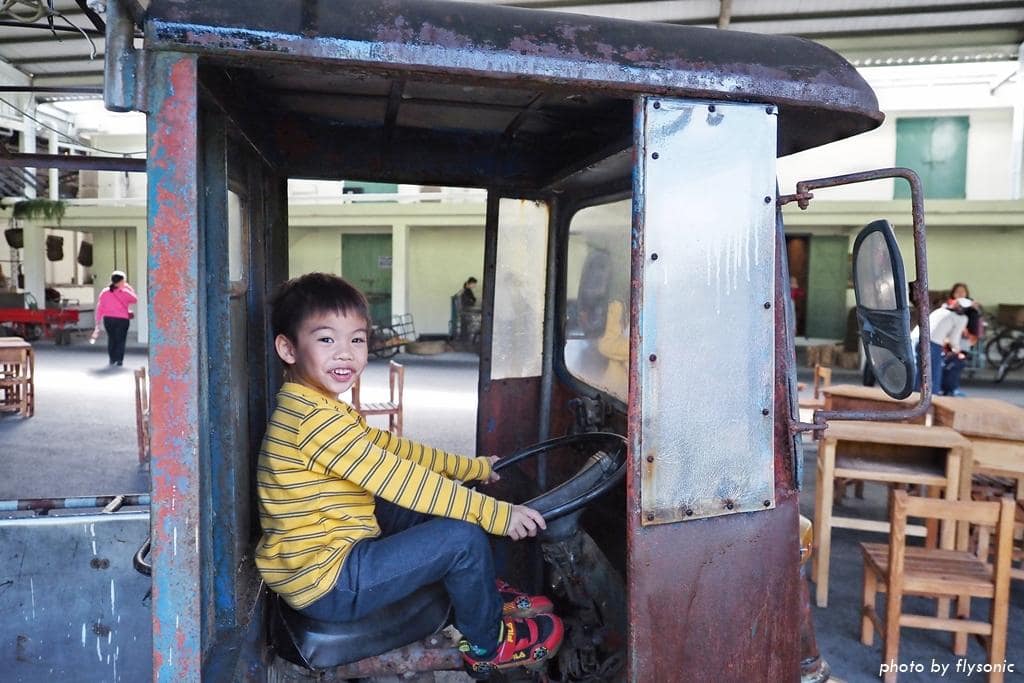 偌大的廣場放置幾輛早期的三輪車、農車供遊客拍照,現場許多小男生都很感興趣,我家兒子也不例外。