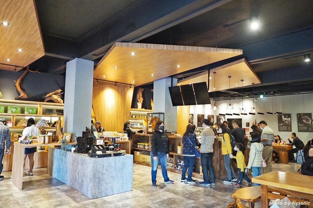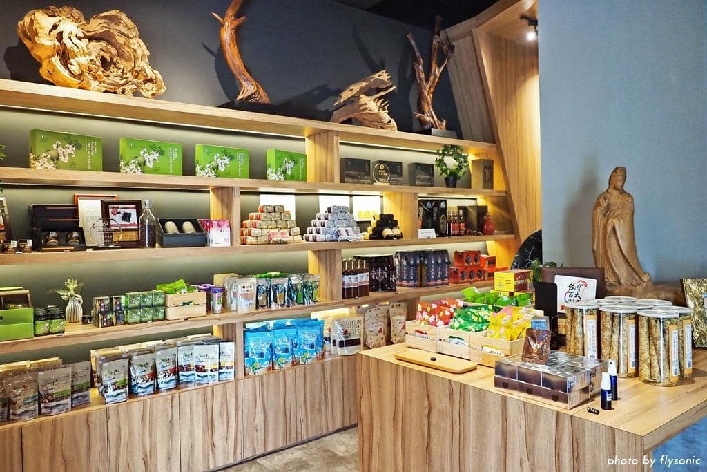 咖啡廳的一角陳列在地農產品販售,有香菇、梅醋,蛋捲、梅片、薑黃、咖啡等,包裝精美,送禮也很體面。
