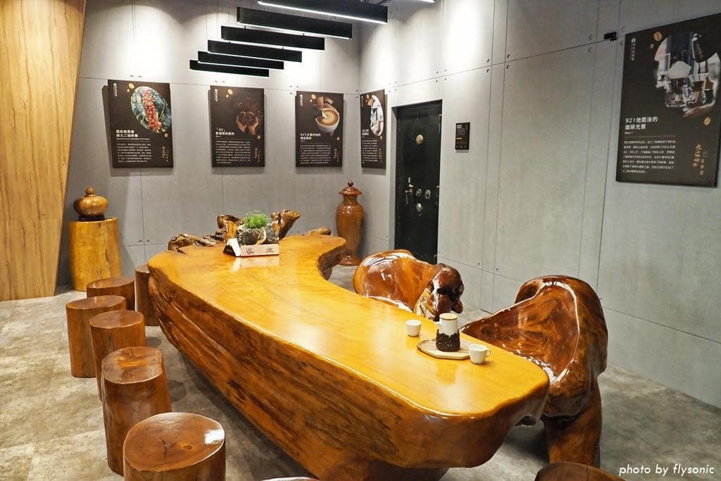 這是咖啡廳裡價值千萬的原木桌椅,旁邊黑色的鐵門,就是以前國姓鄉農會的金庫。