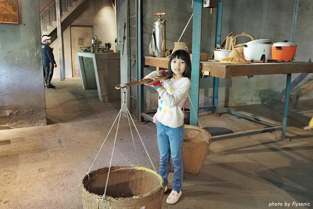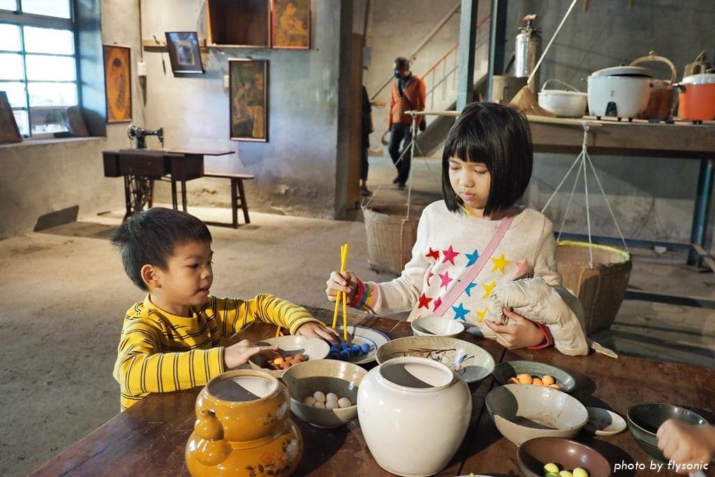 這一間糧倉擺放早期農村生活的日用品。滿滿一桌的湯圓,小朋友都想夾夾看。