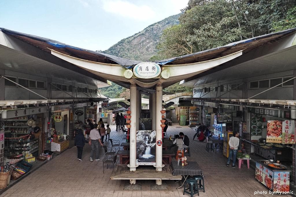 從遊客服務中心旁邊的階梯下去,是左右兩排小吃店。這裡賣的東西不錯吃,也有小朋友的玩具。走到底有公廁,乾淨明亮。
