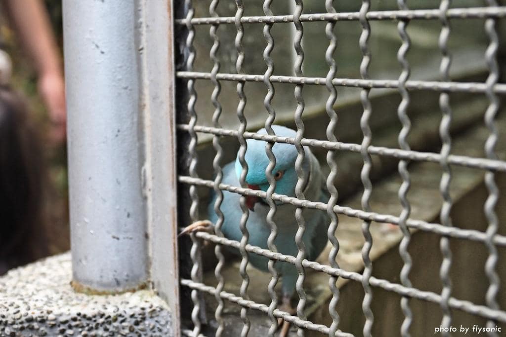 這隻月輪鸚鵡不怕人,靠在鐵網旁邊看著我們,聽到塑膠袋摩擦的聲音,還會過來討吃的。
