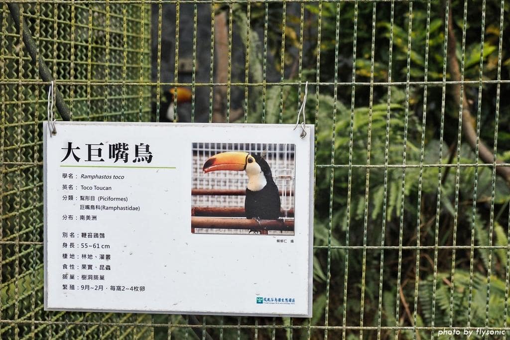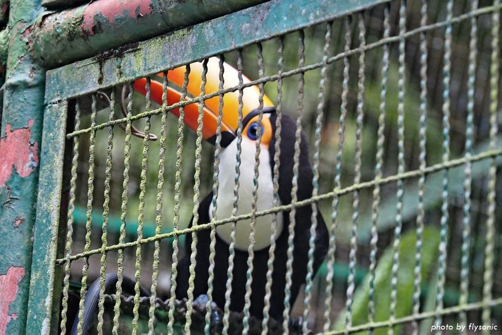 由於園區的鐵欄杆很密,這樣拍攝凸顯不出大嘴鳥的美麗,必須透過籠子的一小片玻璃來拍。