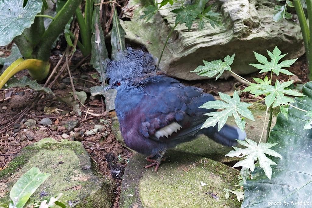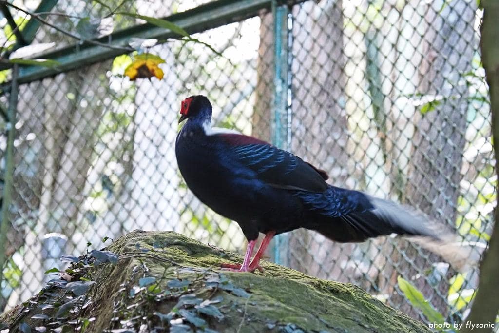 藍腹鷳的外觀跟帝雉有點像,很多人都會搞混,不過只要記住:藍腹鷳的腳是紅色的,公鳥的尾巴有幾根羽毛是全白色的;帝雉的腳是黑色的,尾巴很長,有黑白相間的斑點,這樣就會分辨了。導覽員說,園區也有野生的藍腹鷳,有幾次發現籠子外面的藍腹鷳跑來跟裡面的藍腹鷳交換食物呢,非常有趣。