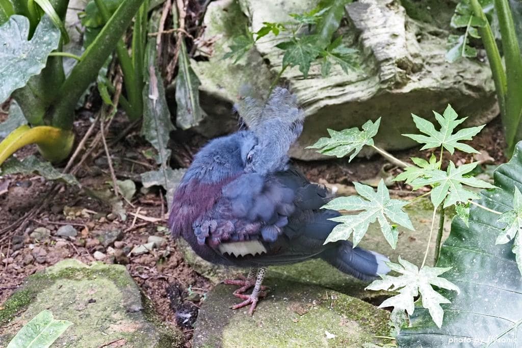 這是一隻藍冠鴿正在梳理羽毛。