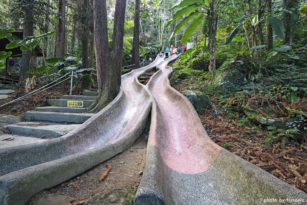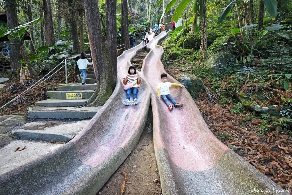 森林溜滑梯是磨石子材質,溜到中段速度會突然加快,小小孩玩的話比較危險。假日很多小朋友在這裡溜滑梯,基本上不用帶板子墊在屁股,因為溜滑梯被磨得很光亮。