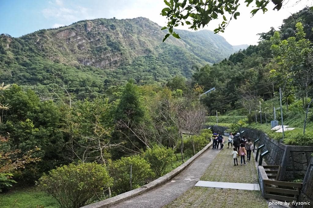 園區的導覽員帶大家參觀 A、C 區,全程大約 1.5 小時,就是走紅、藍線標示的路線。中間紅色的圓圈是遊客服務中心,在那裡集合。右上角咖啡色圈圈是國家一級古蹟「萬年亨衢」石碣所在,可以順遊(參見【南投鹿谷】萬年亨衢、佑我開山、德遍山陬、入番撤禁告示碑—八通關古道一級古蹟之探尋)。