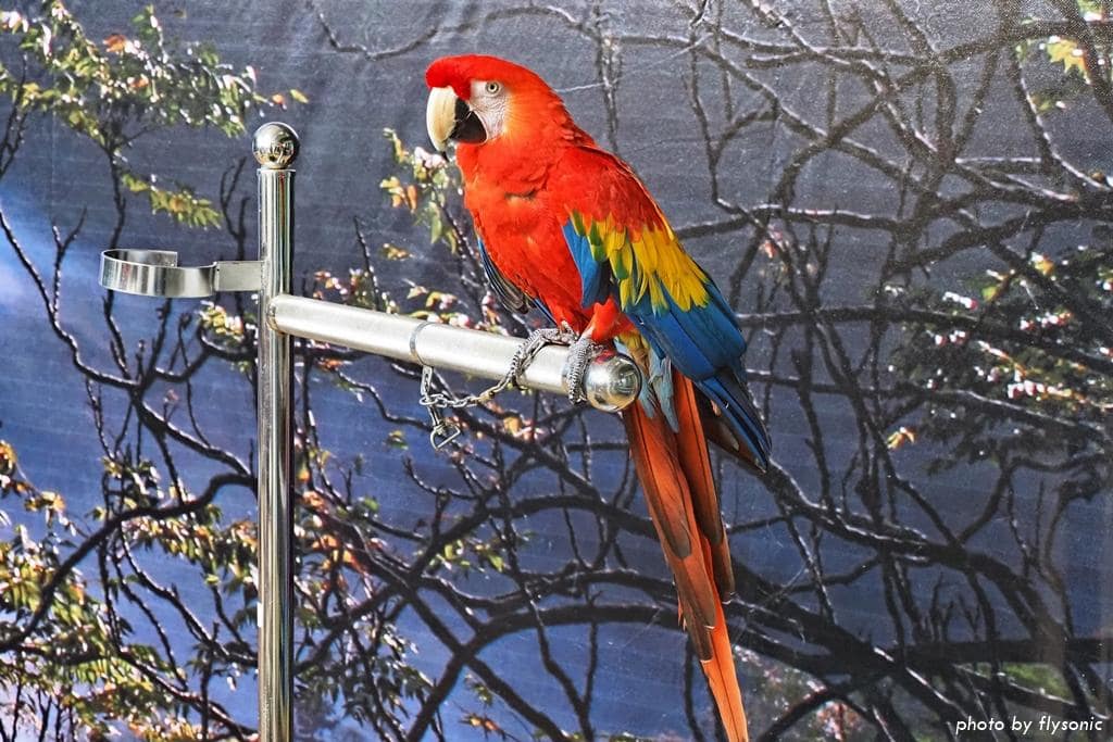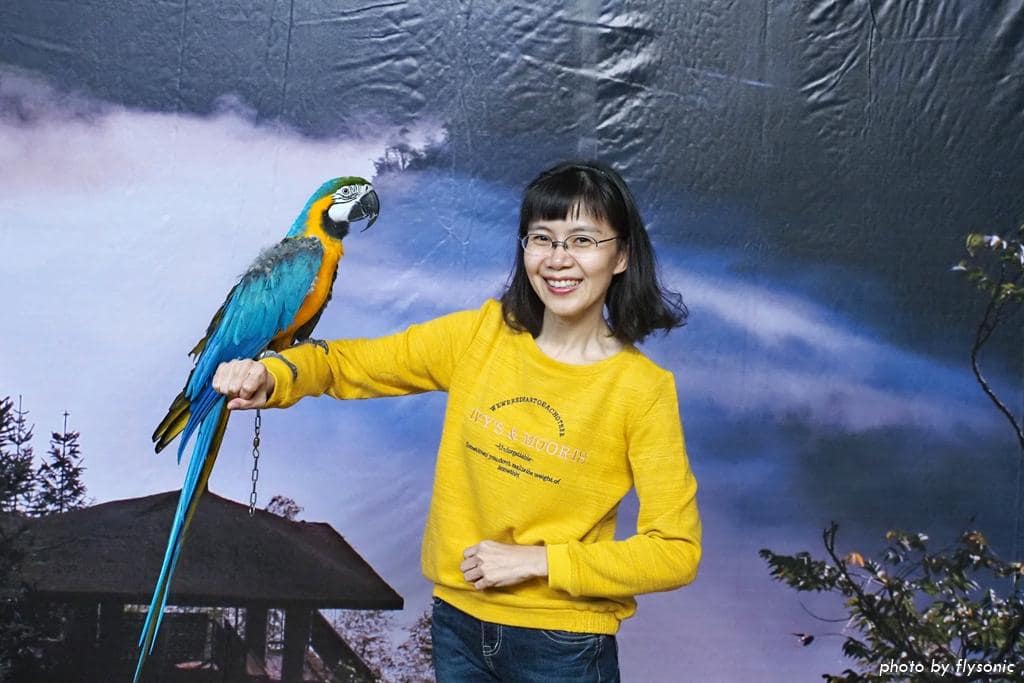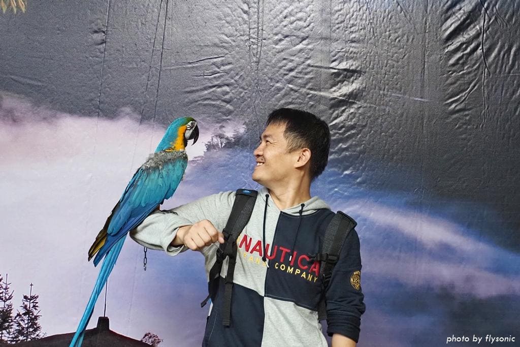 每逢週二、四、六上午 11:00 及下午 3:00 各有一場跟鸚鵡拍照的活動。解說員先介紹主角:彩衣與小藍。