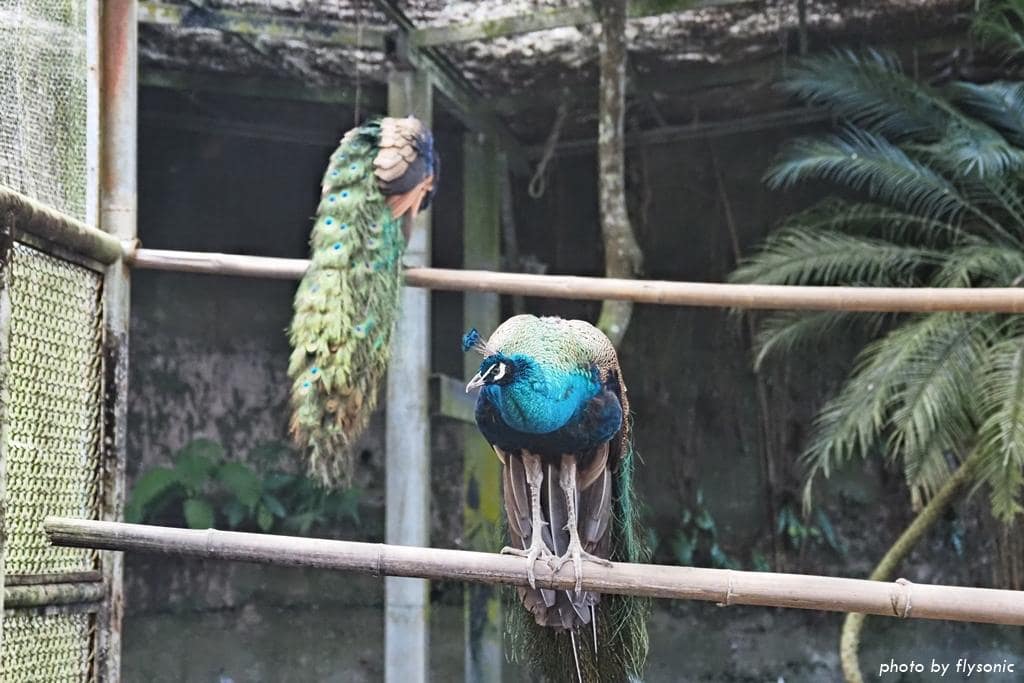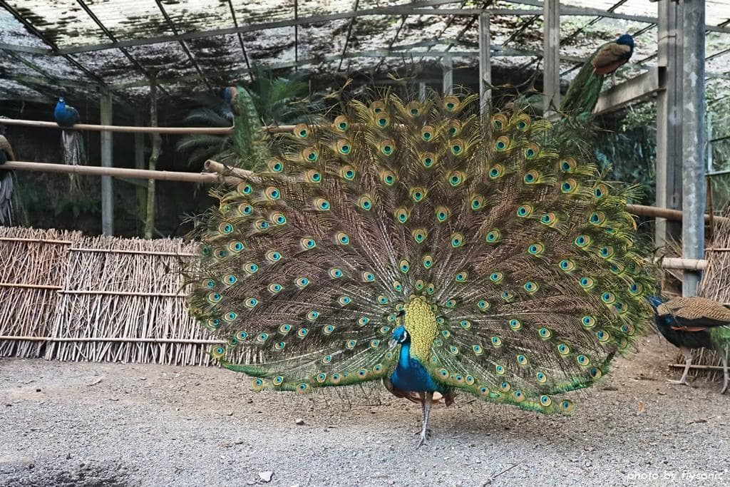 孔雀園裡有藍孔雀、綠孔雀,不論藍綠,羽毛都非常鮮豔。更特別的是,還有白孔雀呢。現場剛好有一隻孔雀開屏,讓我們驚呼連連。