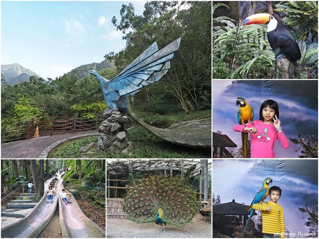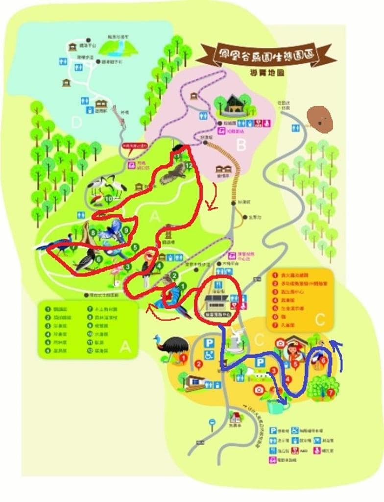 鳥園分為 A、B、C、D 四大區塊,其中 A 區是必訪,鳥類最豐富,森林溜滑梯也在這區裡。B 區的松鶴園目前在整修,不能參觀。C 區有鸚鵡、孔雀及各種體驗活動。D 區有鳳凰谷瀑布,下雨天或天氣不好時禁止通行,一般人較少去那邊玩。