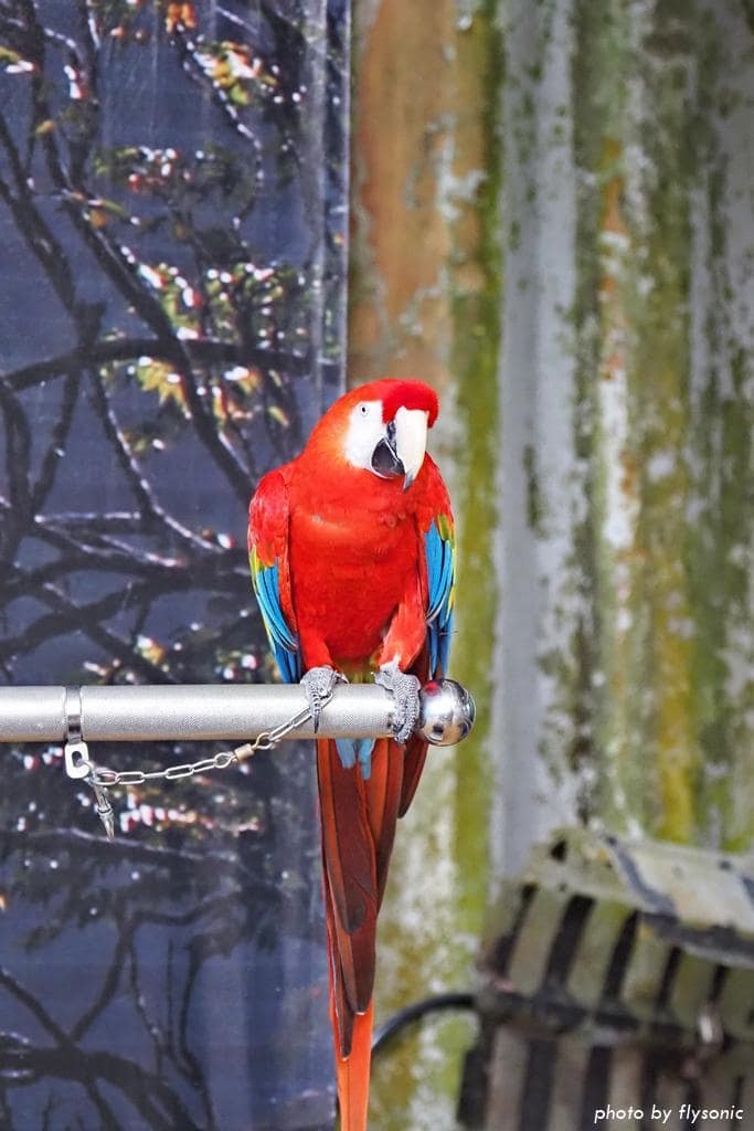 這是彩衣,他是一隻五彩金剛鸚鵡,鳥園的開園元老,民國 71 年就已經來了。他是一級保育類動物(瀕臨絕種野生動物),色澤非常美麗。由於彩衣年紀大了,性情不穩定,所以並沒有跟大家拍照,而是在一旁靜靜的觀察我們。