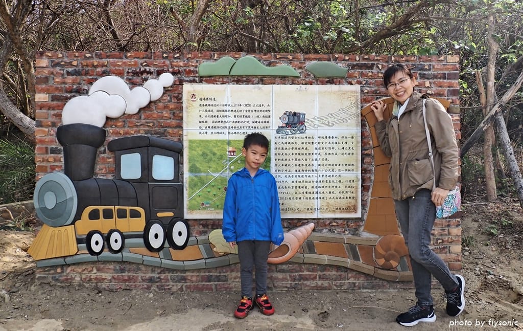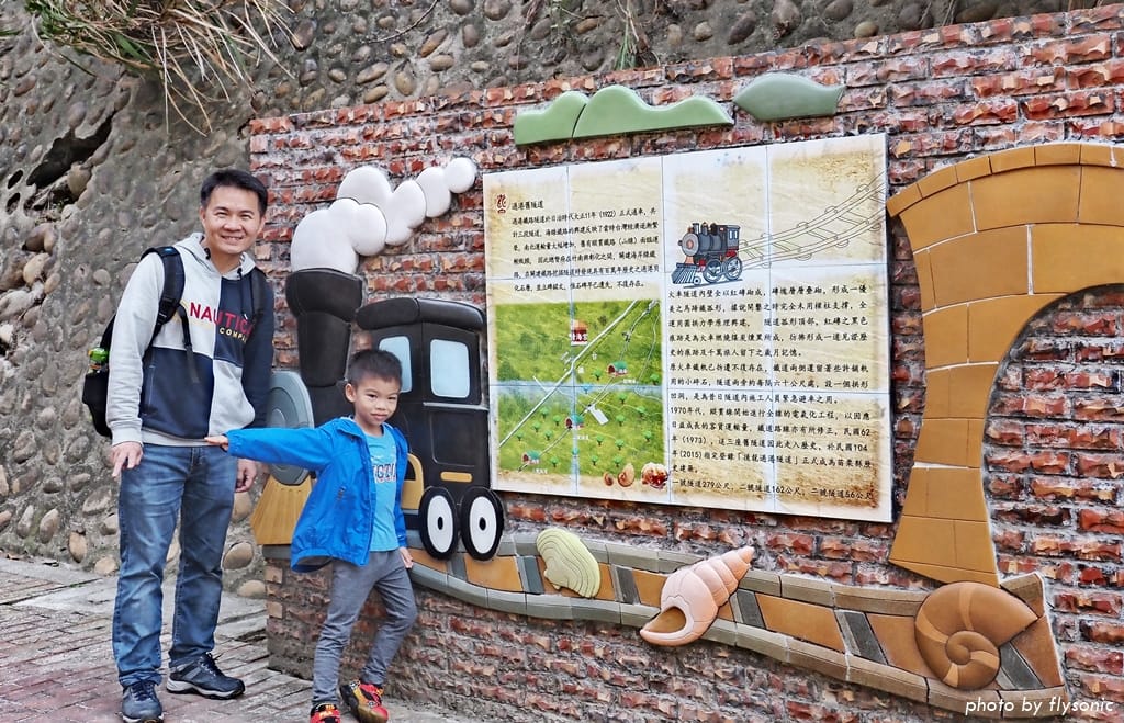 隧道口外的解說牌童趣未泯,火車與貝殼表示過港隧道群及貝類化石層是這裡著名的景點。