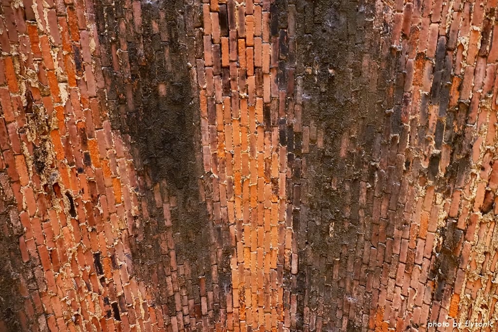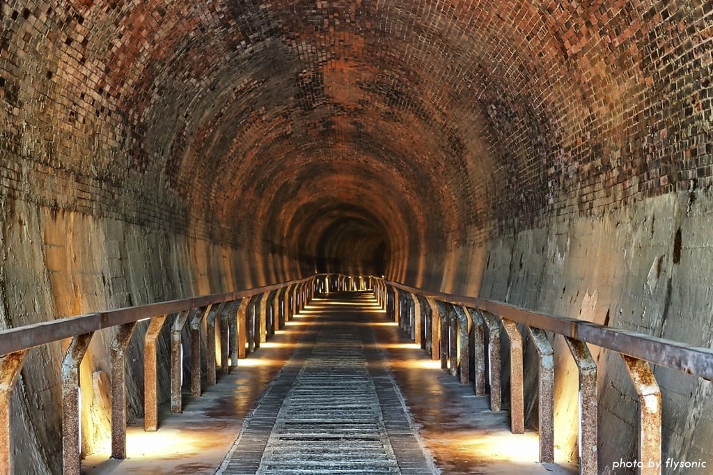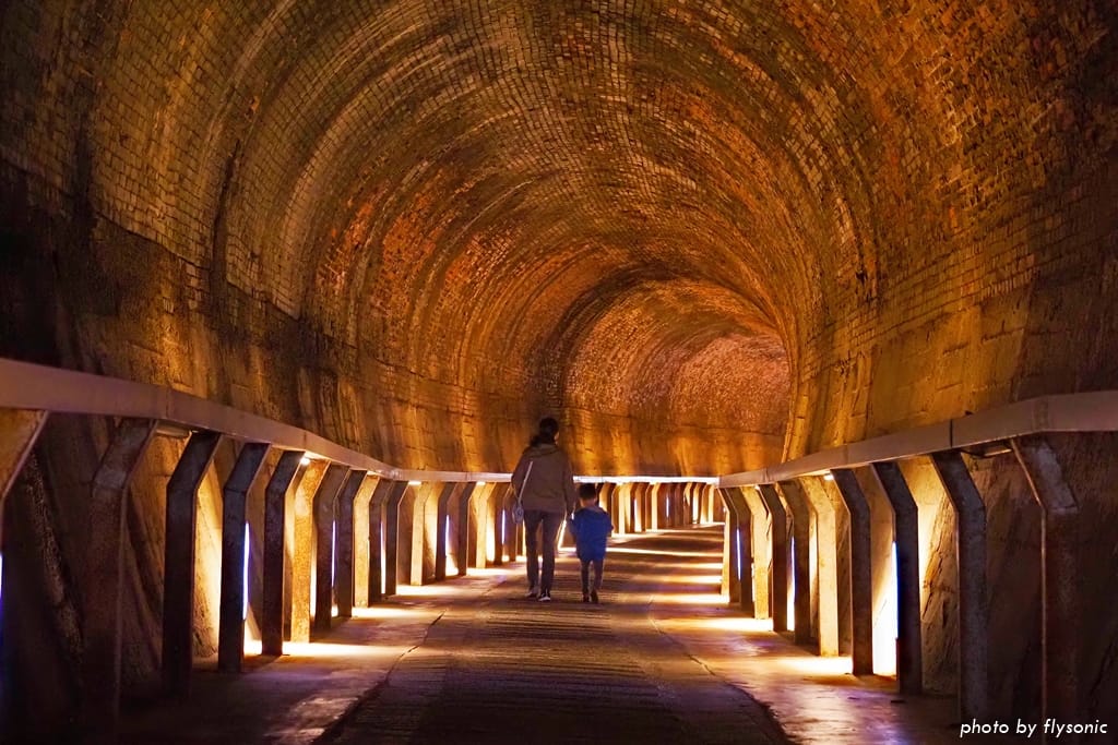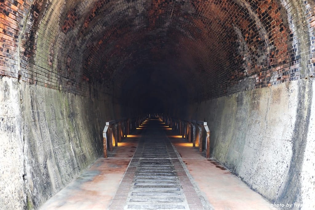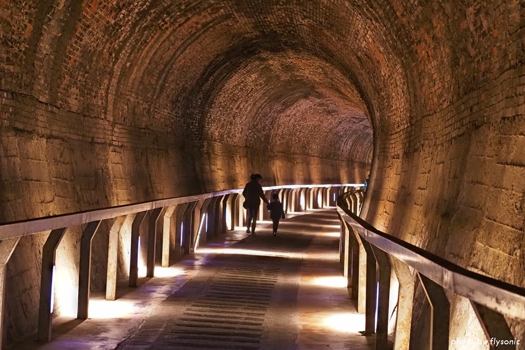 仔細看還可以發現,隧道內的牆壁全部是以紅磚砌成,磚塊層層疊砌,形成優美的馬蹄弧形。據說開鑿的時候,沒有用到任何樑柱支撐,完全運用圓拱力學原理興建,相當厲害啊!