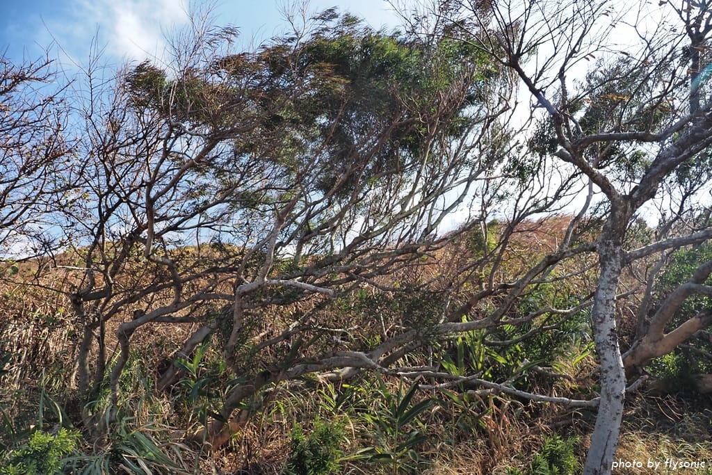 路邊的樹在強風長年吹拂下,枝幹都彎曲了。