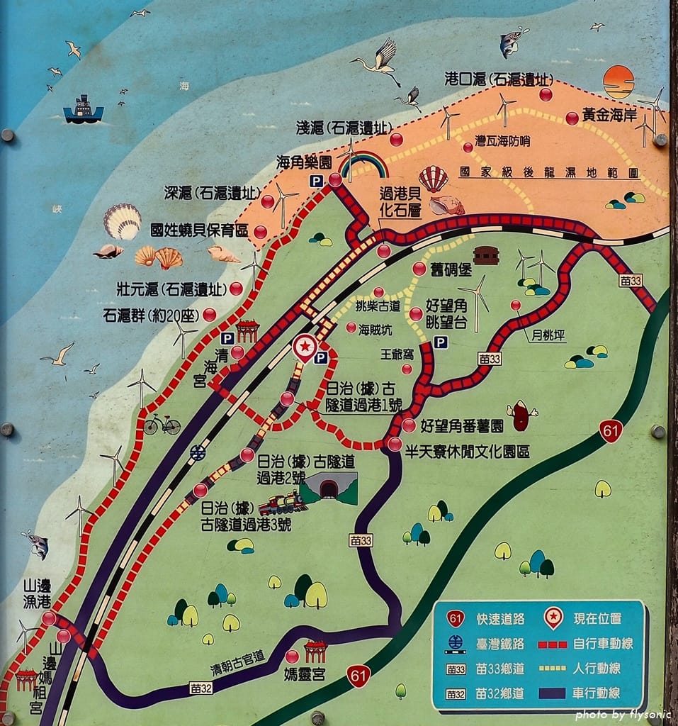 來到苗栗後龍的半天寮好望角遊憩區遊玩時,除了大風車之外,還有兩個地方非常值得一看—「過港貝化石層」以及「過港隧道群」。