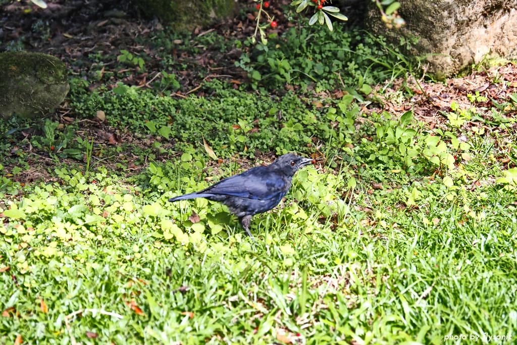 剛好有一隻紫嘯鶇飛過來,撿食草地上掉落的果實,我趕緊拿起中長焦鏡頭拍攝幾張。