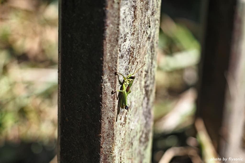 當我們準備離開時,在瀑布前方的欄杆上,兒子又發現一隻蚱蜢。