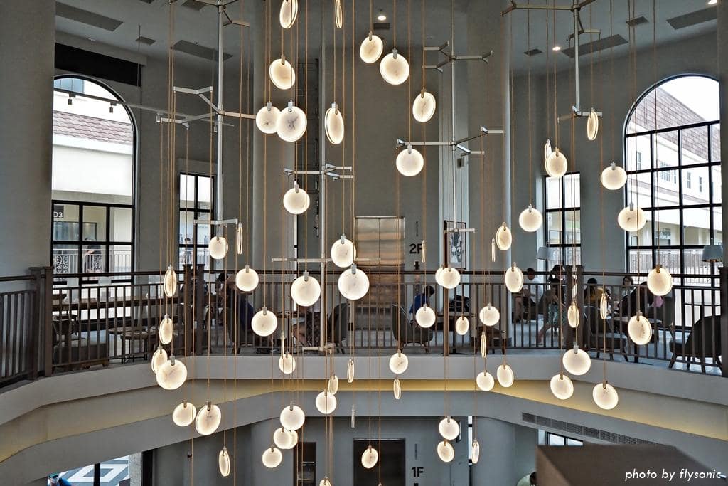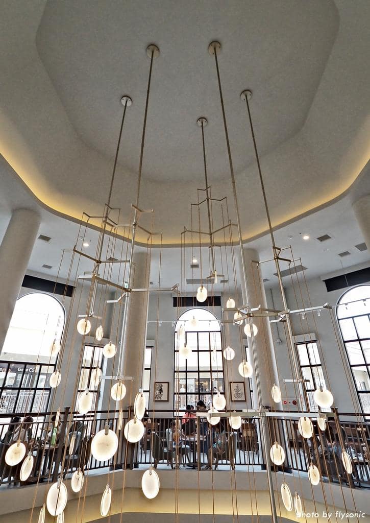這間星巴克的天花板挑高 17 公尺,有一個中島吧檯,上方垂降五組造型吊燈,錯落有致,相當好看。