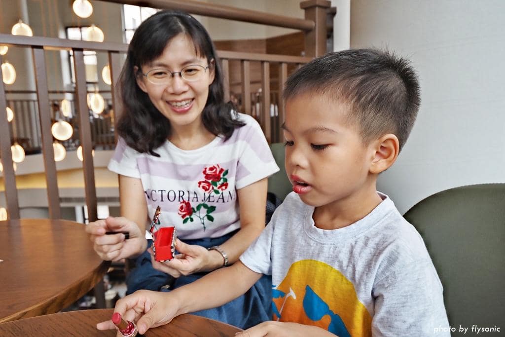 ▲兒子看媽媽在擦口紅,竟然拿起來也往自己的嘴上塗,還塗得有模有樣的,真是搞笑。