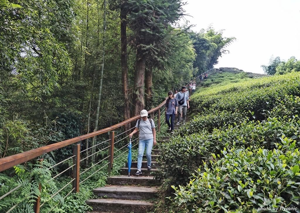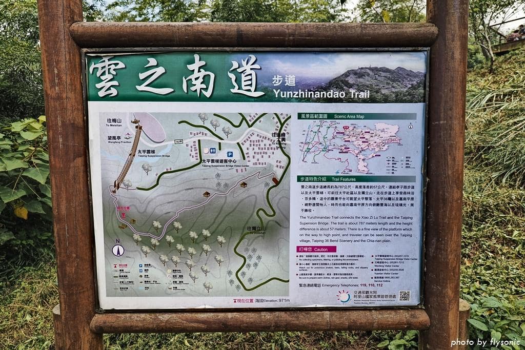 雲之南道步道長 787 公尺,除了前段與後段的階梯之外,平緩好走,沿途可以欣賞茶園風光,展望也佳,可以看到太平聚落、太平的髮夾彎等,因此大部分遊客都會走這條步道串連到老街。