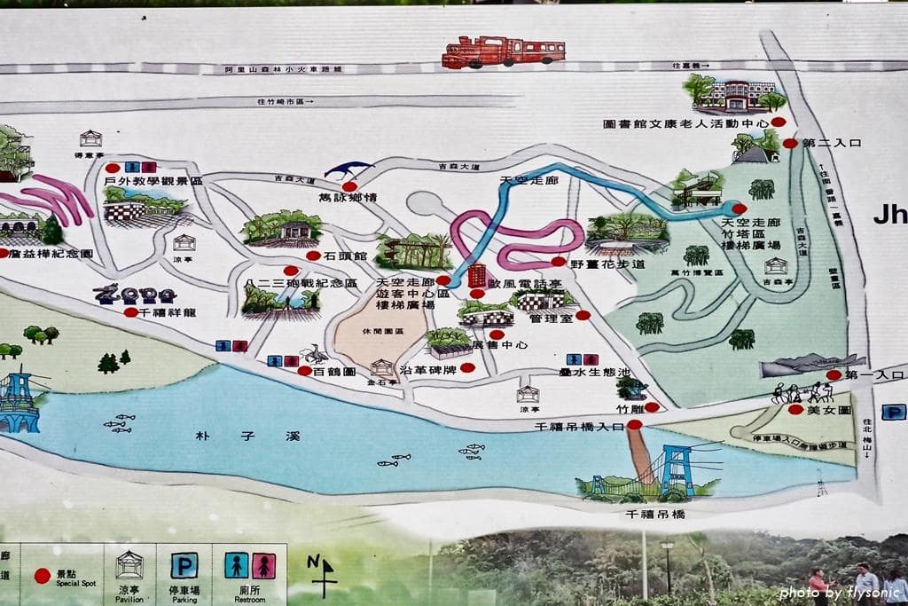 嘉義縣的竹崎親水公園位在台三線公路旁邊,是一座面積超大的複合式公園。裡面人氣最旺的是兩座吊橋(千禧橋、弘景橋)、三個步道(天空走廊、野薑花仙子步道、杜鵑花仙子步道),以及兒童戲水區。