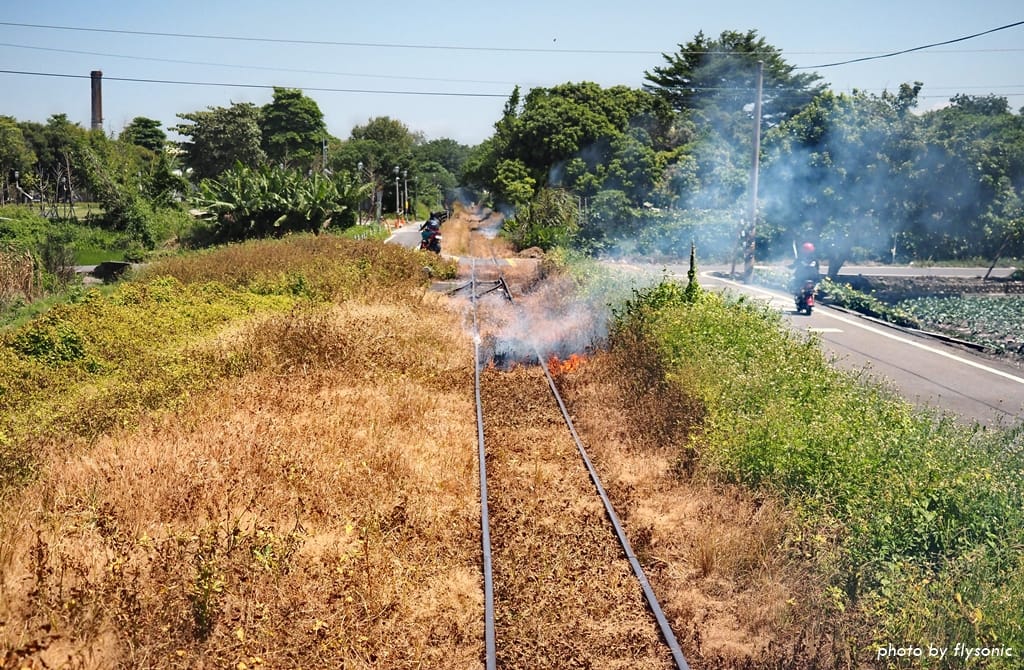 ▲蒸氣小火車的動力來源是用燃煤式的蒸氣推動,行駛時煤炭渣不時的掉落在軌道上,由於溫度過高,引燃雜草,成了這副景象。我看見時覺得好新奇,頓時想起湯瑪士小火車每次出包時的口頭禪:「我的煤炭渣呀!」