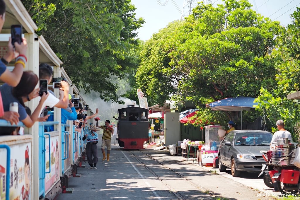 ▲大約經過 5- 10分鐘左右,黑頭仔就要啟程載我們回糖廠了。路邊的攤販仍然奮力的叫賣,不放棄最後的一分一秒。此時黑頭仔從列車的前端,沿著旁邊的鐵軌倒退嚕。