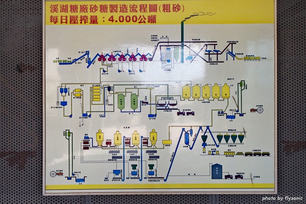 ▲製糖流程圖。溪湖糖廠是專門製作二砂的廠,每日壓榨量最高達4000公噸,曾經是全台製糖量最大的糖廠。