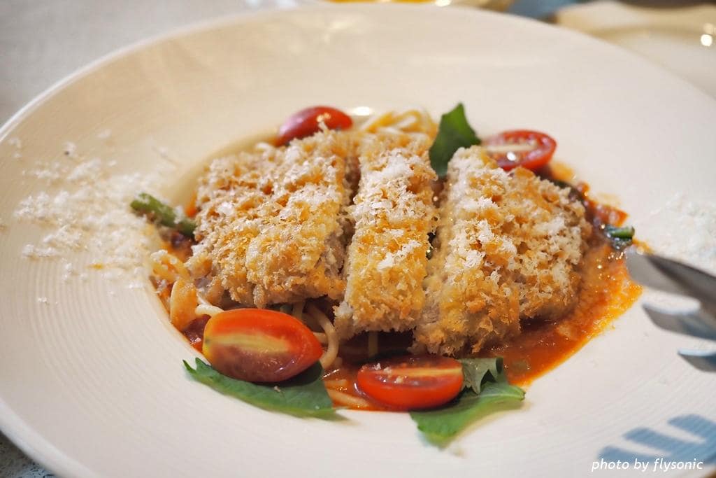 ▲第一個主餐是豬排義大利麵。炸豬排很新鮮,可惜份量小,蕃茄醬汁濃郁偏酸,兒子說喜歡。