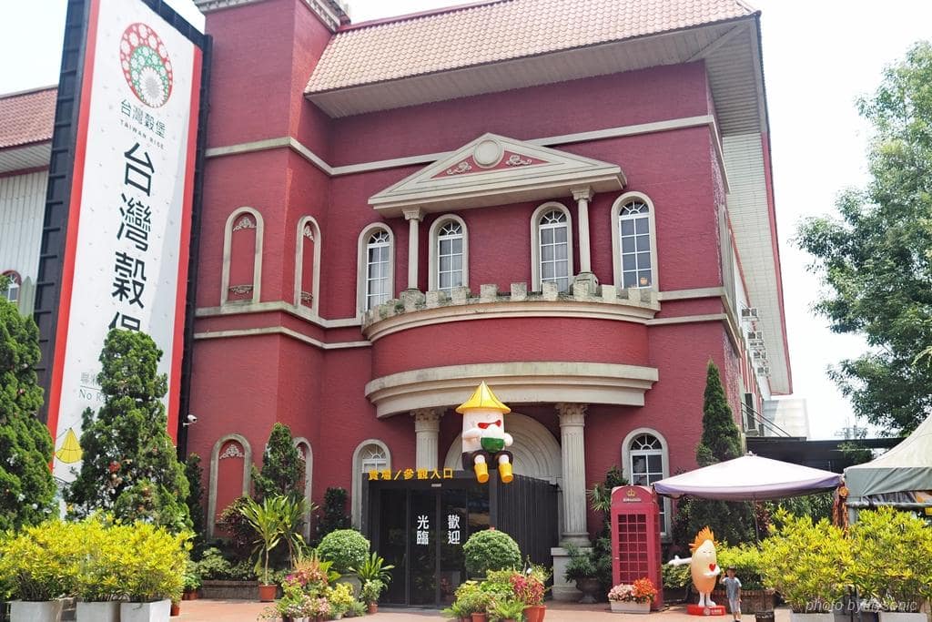 台灣穀堡的外觀是紅色的兩層建築,裡面展示關於稻米的知識及文化。