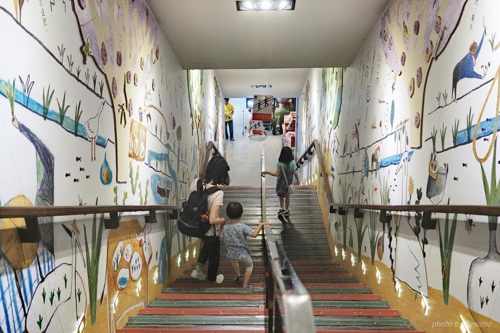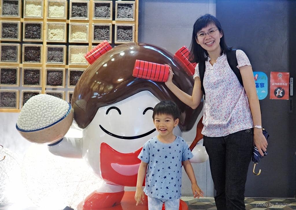 兒子喜歡跟娃娃公仔拍照,後面的牆壁是館內蒐集各國的稻米,展示成一整面的高牆,相當壯觀,但是我沒有拍好。