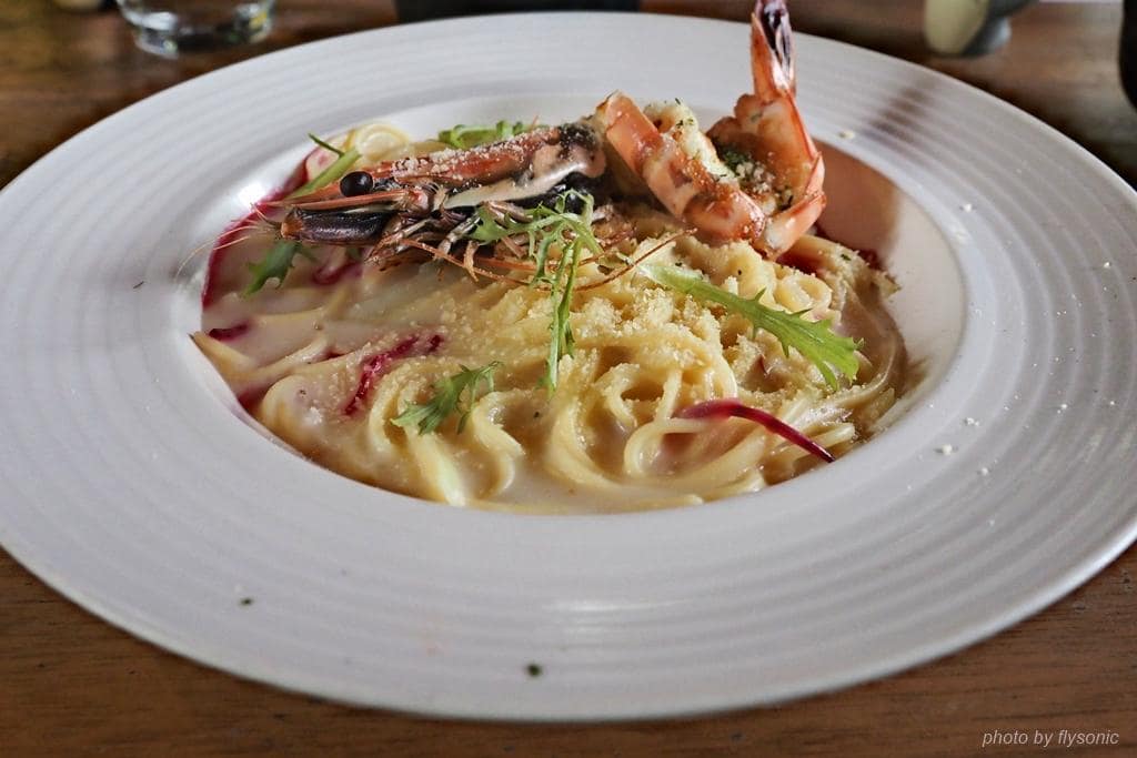 ▲點了一份烤蝦義大利麵,有附湯。味道還不錯。