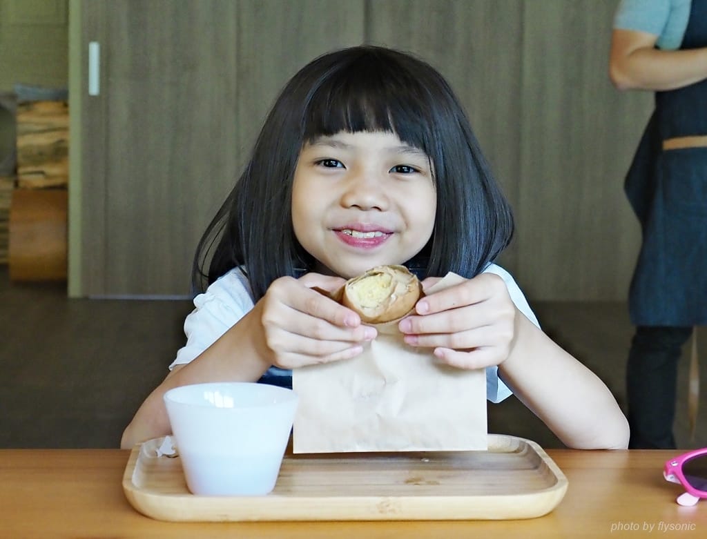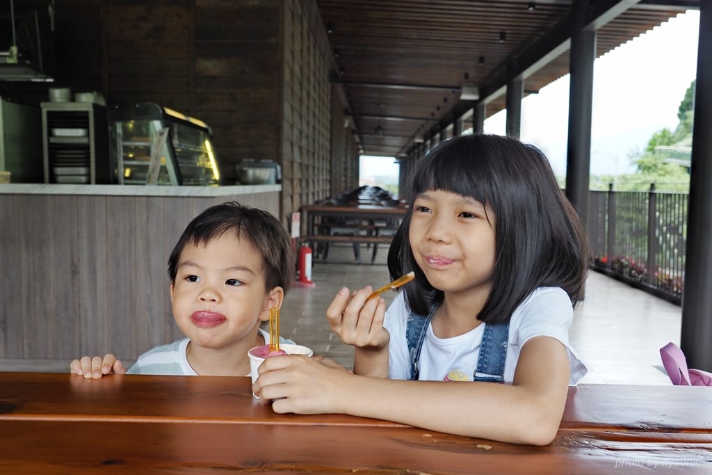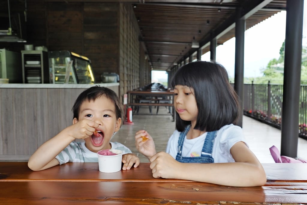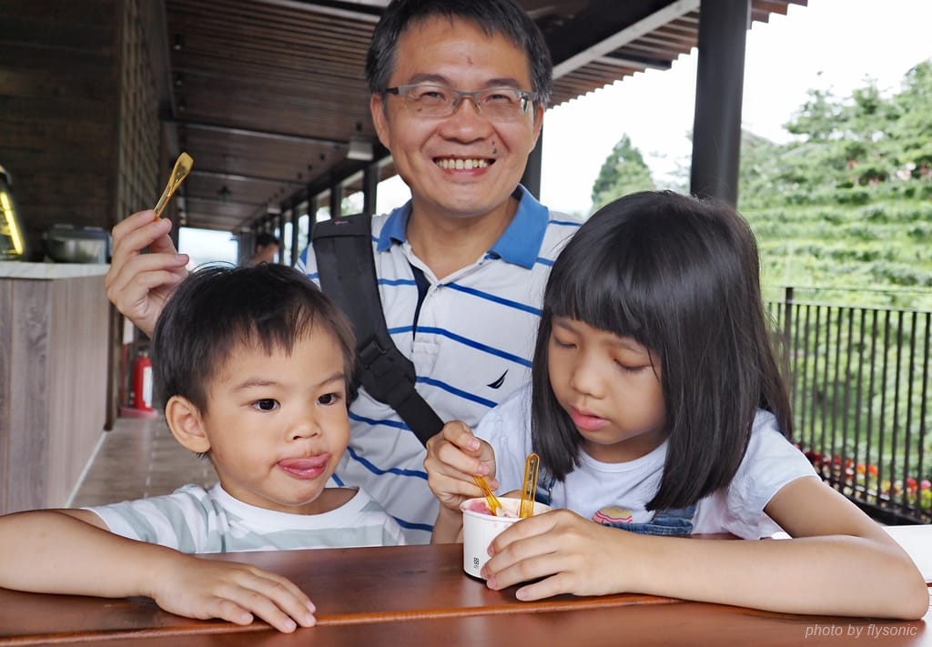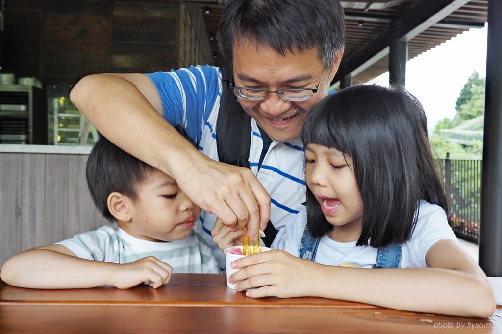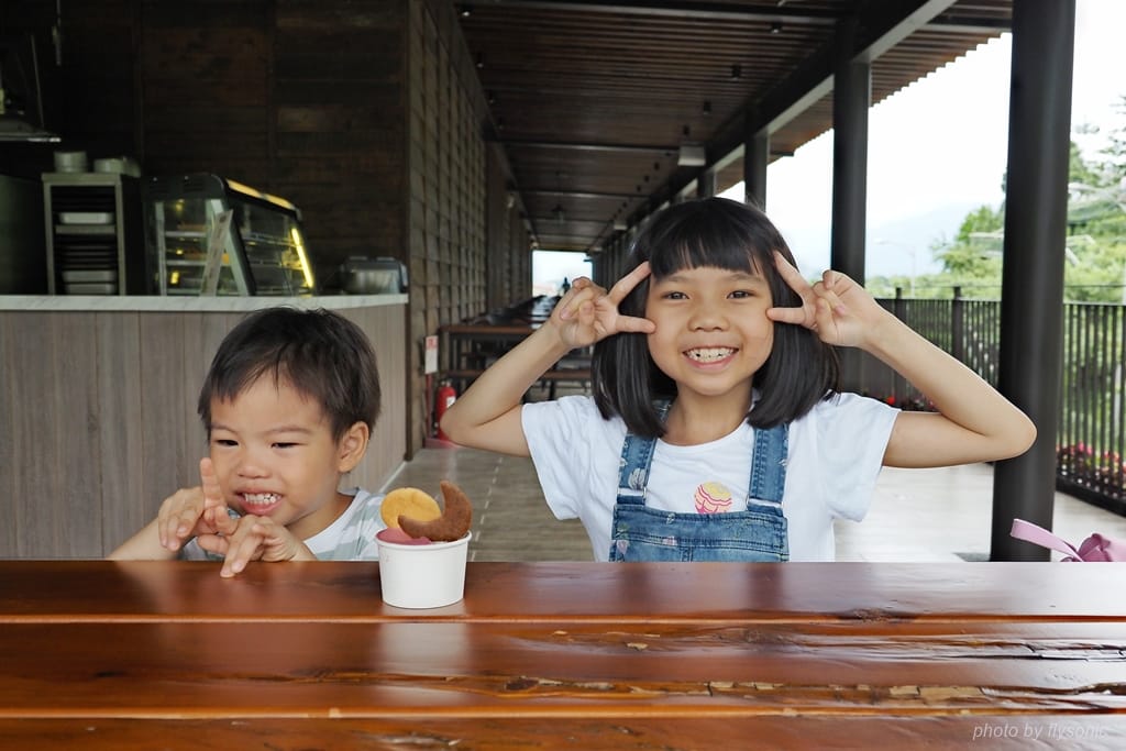吃完茶葉蛋之後,天氣很熱,我們到外面來吃手工義式冰淇淋。口味都是小孩自己挑選,工作人員放上日月造型的餅乾,小孩好喜歡。