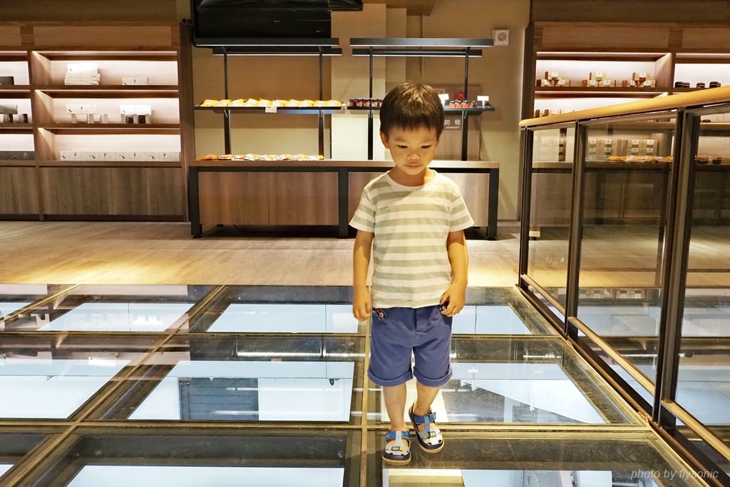館內有製茶設備的展示,但是沒有人解說,我們也看不懂。兒子踩踏在透明的地板上,覺得很有趣。