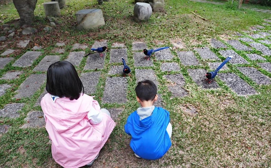 像我們是都市軟腳蝦,到了林場之後,在大草原放風是最好玩的。草皮上趣味的遊樂器材、附近散步的公雞、林間美麗的台灣藍鵲,都讓孩子們玩得很盡興。