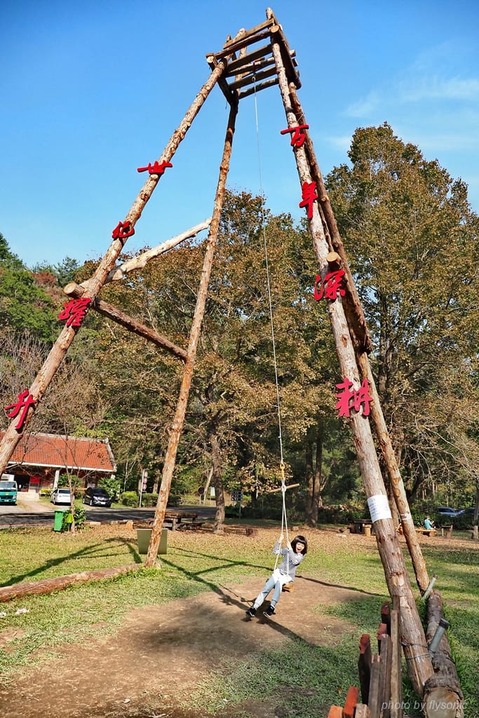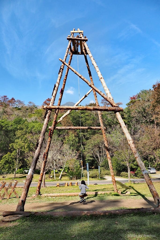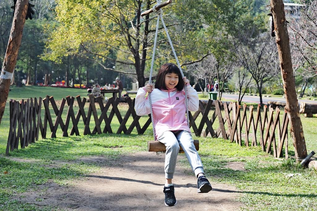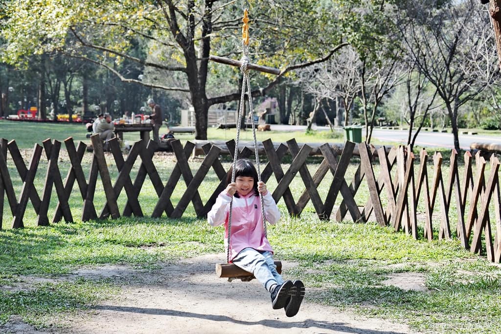 ▲進到園區的大草皮區,這裡有一座木造的、高聳的、單人盪鞦韆。它不是很好盪,完全無法控制方向,會自己亂轉圈,女兒卻很喜歡玩。