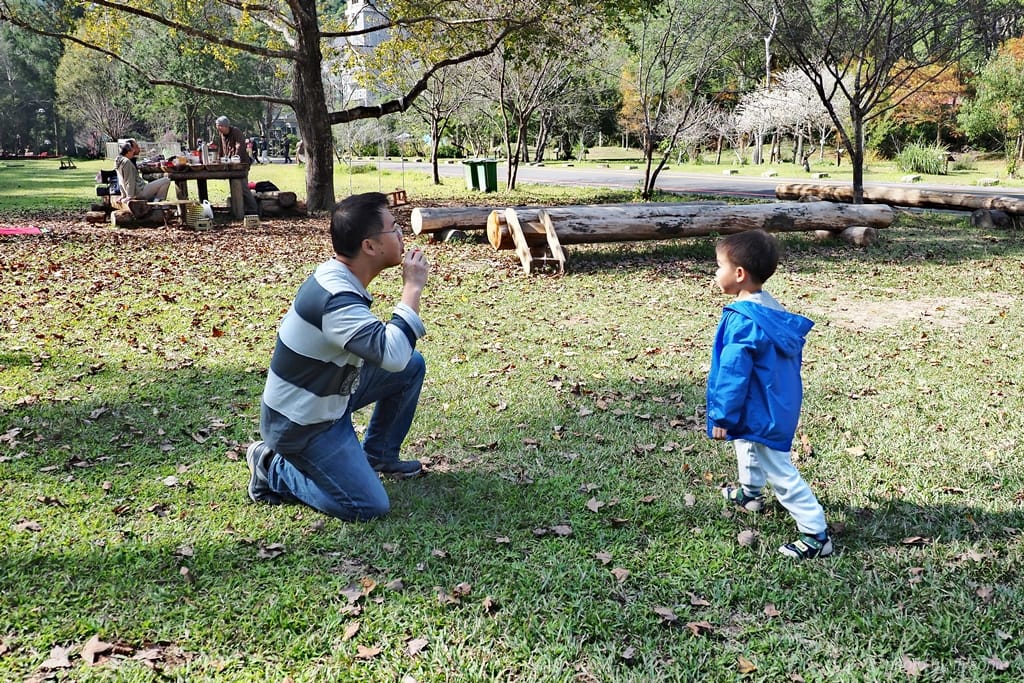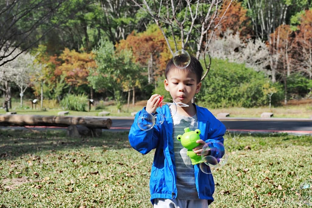 ▲兒子沒辦法盪鞦韆,在一旁吹泡泡。他現在越吹越好,不會吃到泡泡水,也不會將泡泡水灑出來。