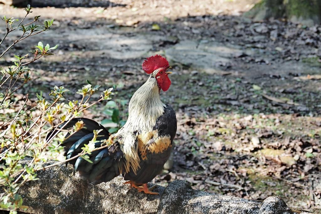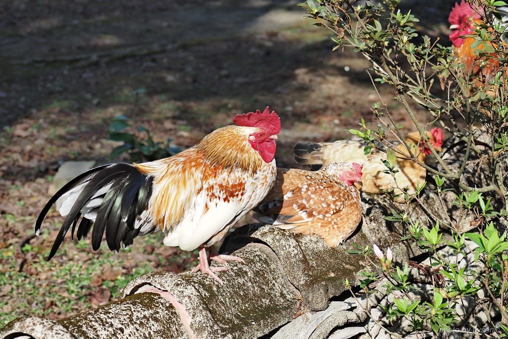 今天氣溫舒適宜人,雞群都出來散步。公雞昂首挺胸,仰天長嘯,頓時雞啼聲此起彼落,小孩覺得有趣,竟然也學公雞叫了起來。