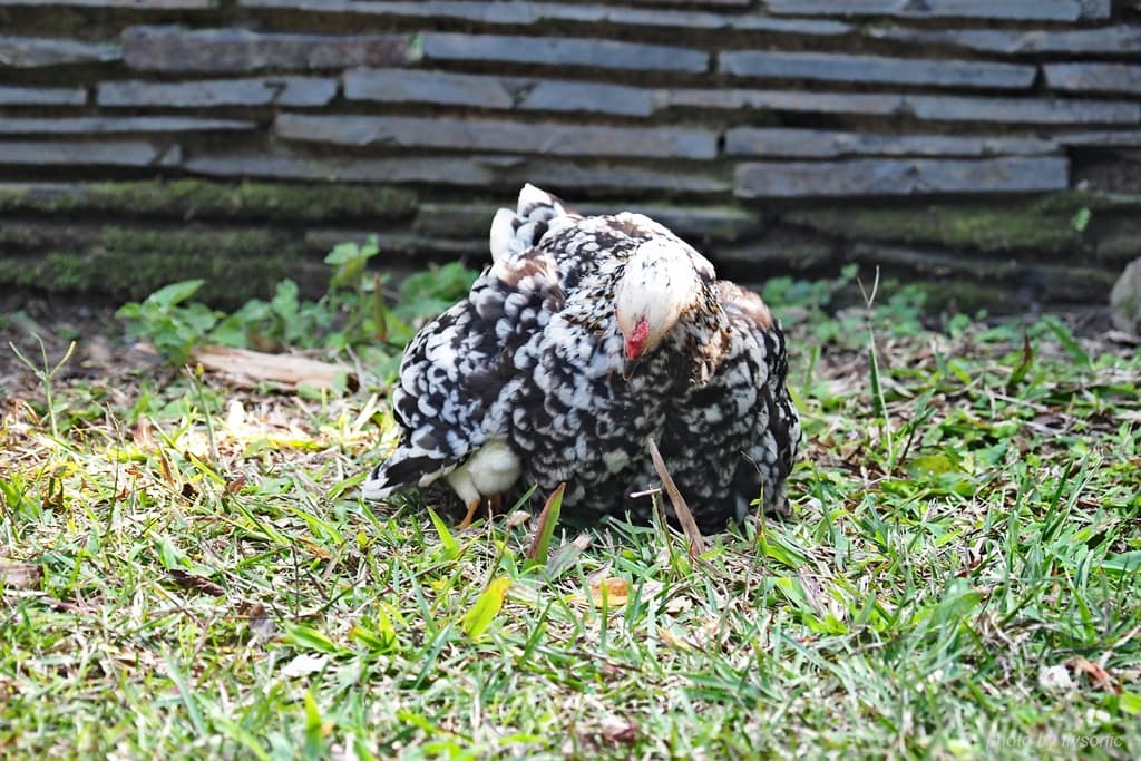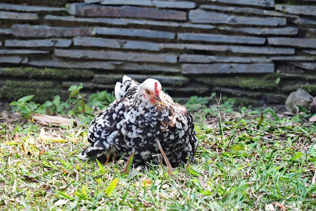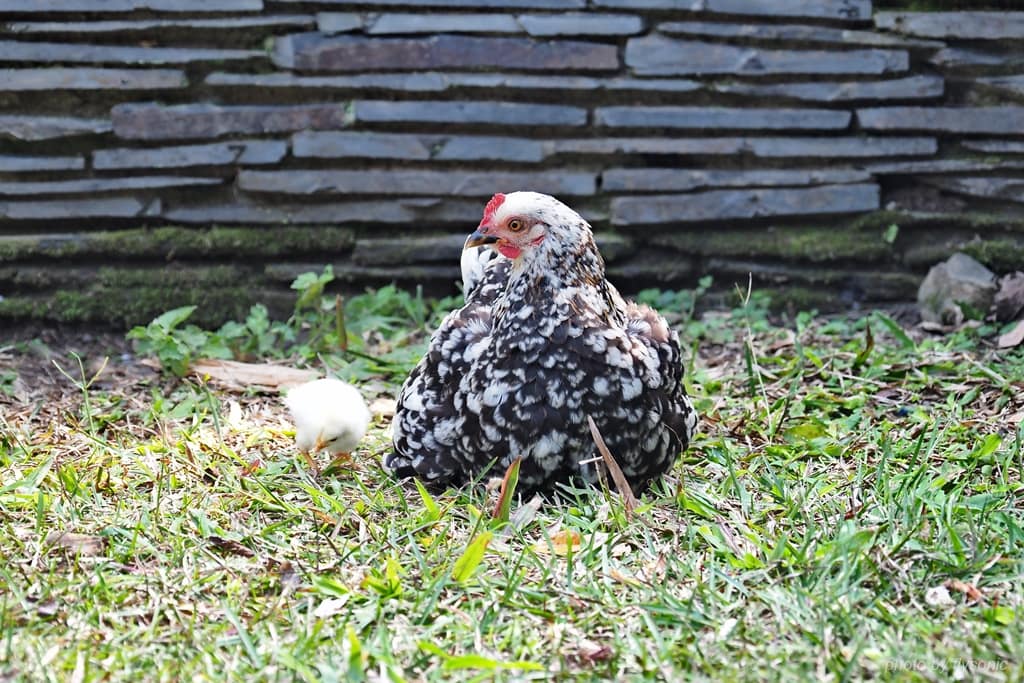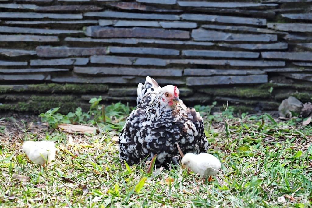 ▲在咖啡學堂前方的草皮,有一隻母雞帶著小雞到處找蟲吃。