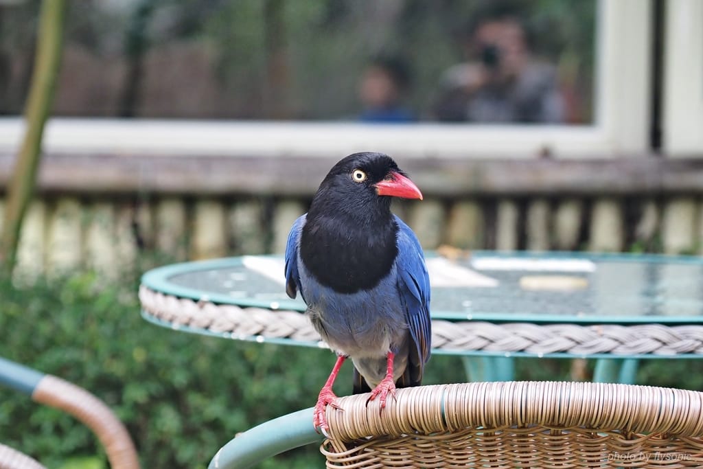 點了一杯布丁,配上自己帶來還沒吃完的餅乾,坐在外面的桌椅上吃的時候,發現有一群台灣藍鵲本來高高在樹枝上觀察,看見只有我們這一家人,就大膽的飛下來討食物。