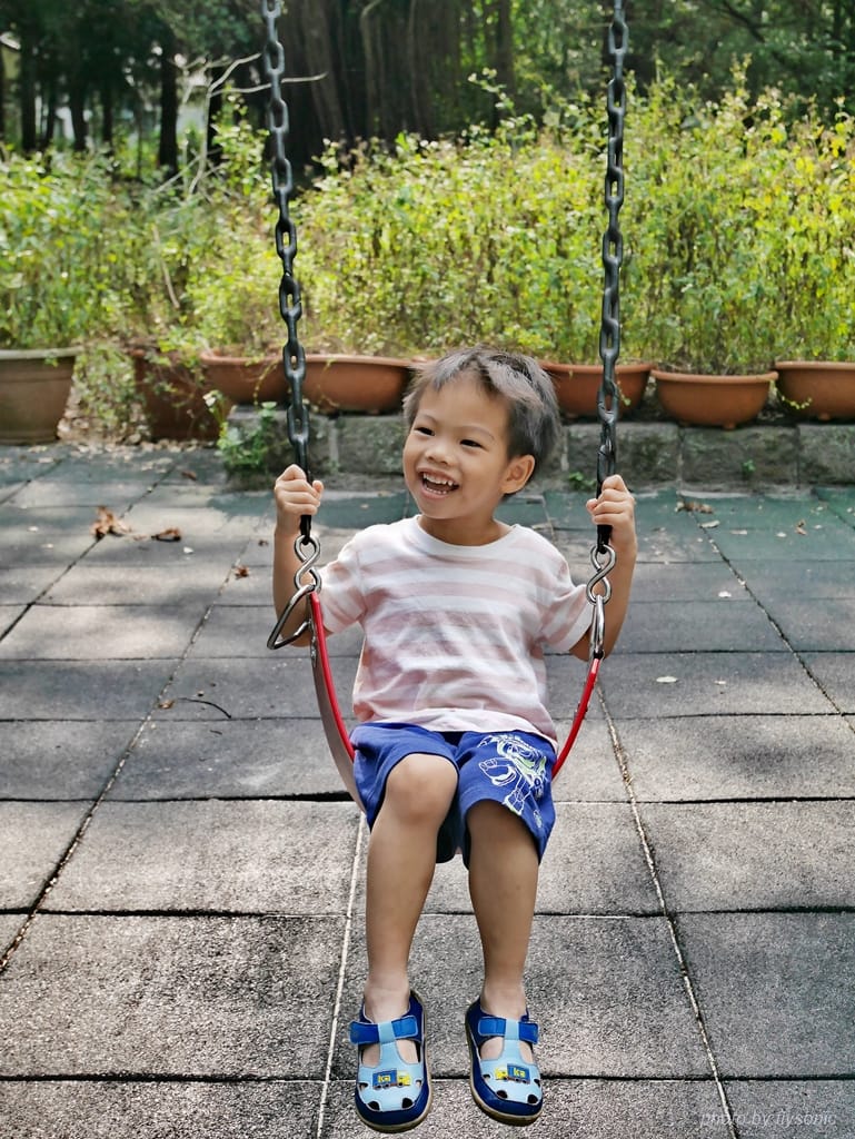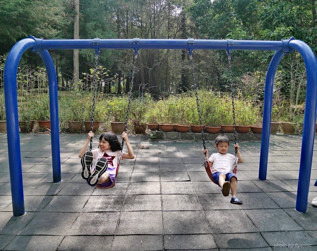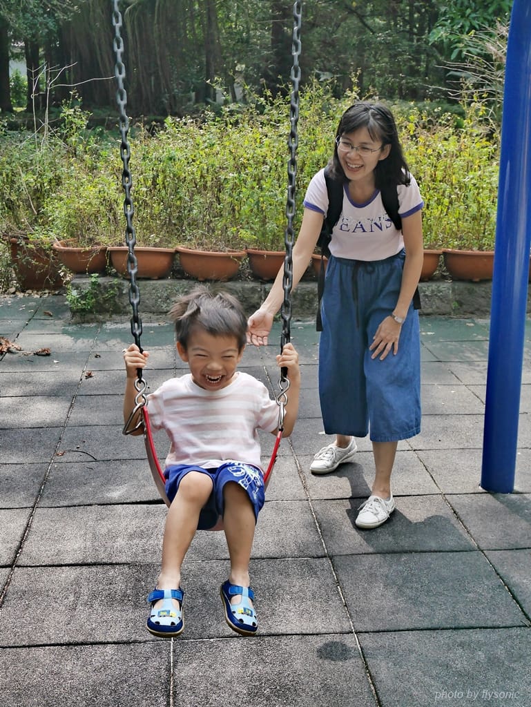 兒子要從後面幫忙推一把,女兒就完全自己來,盪得很高,鏡頭都跟不上。
