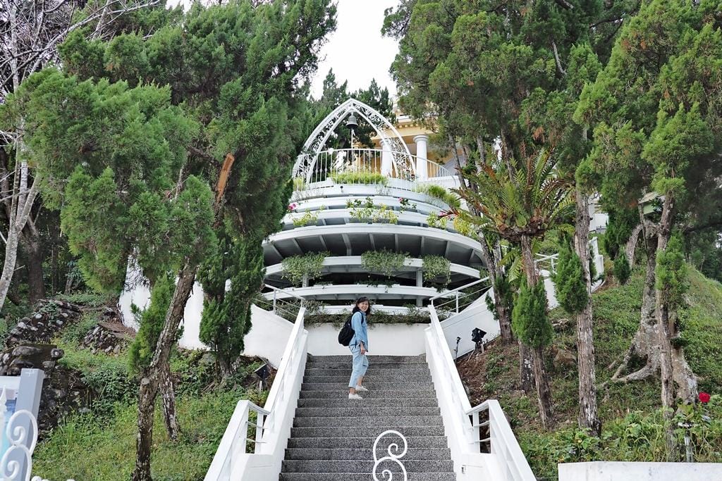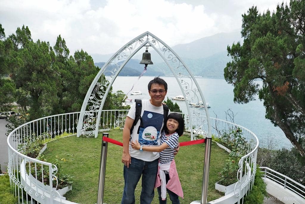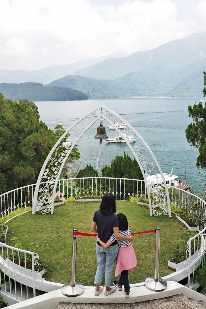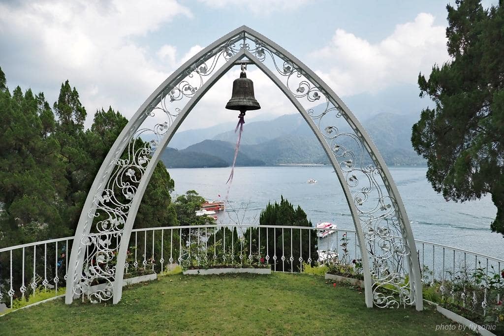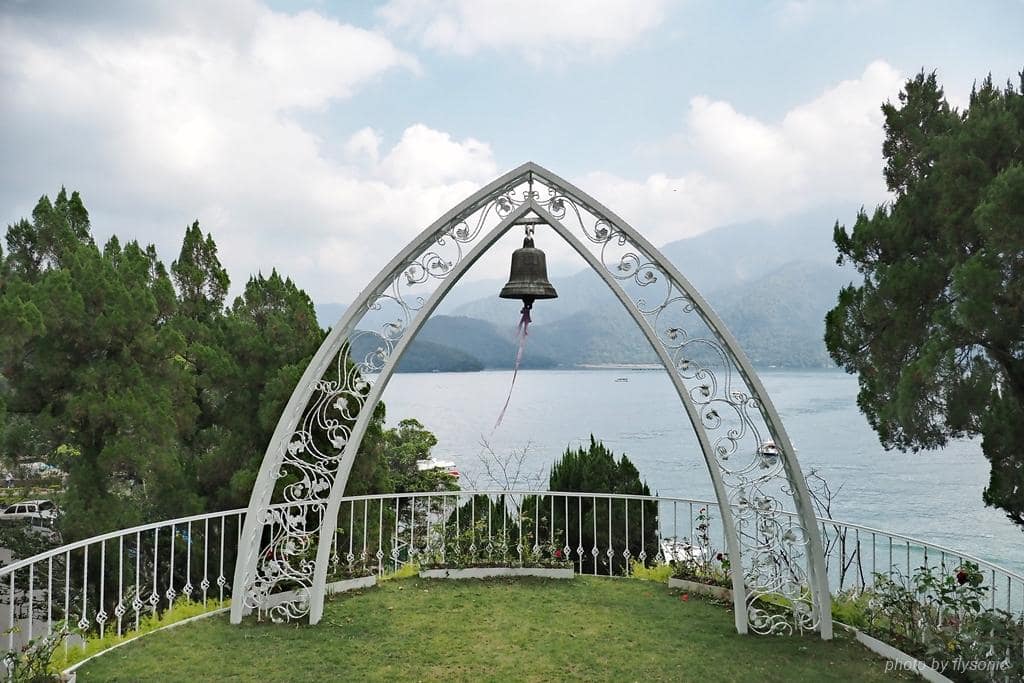 ▲白色造型拱門與鈴鐺,在山光水色的襯托下特別美麗,光是站在這裡就有種幸福的感覺。
