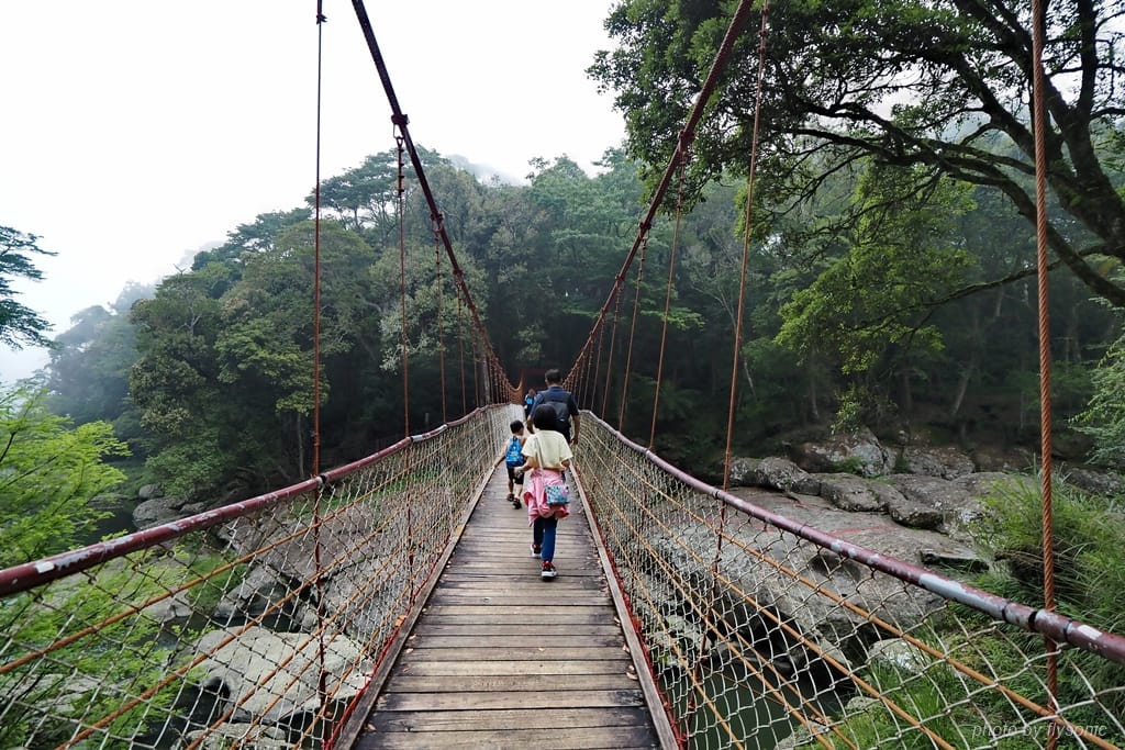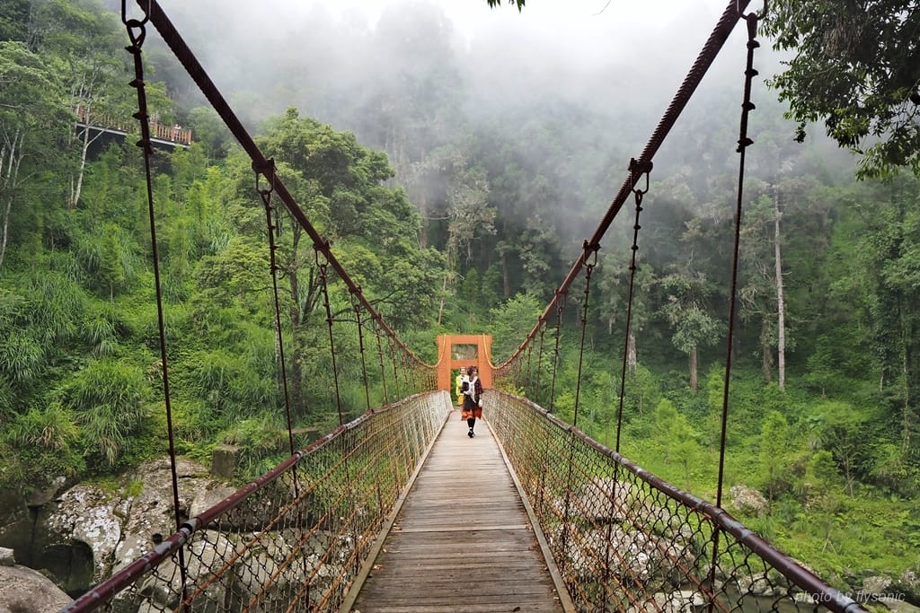 ▲走到另一端,回望雲霧中的八八吊橋,山谷深幽,隔煙朦朧。