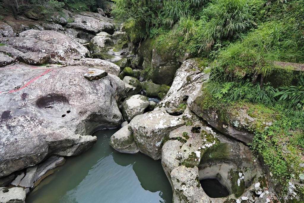 ▲壺穴是溪水的強烈渦流在硬度不同的溪床岩石,經年累月之下,把石頭侵蝕出像井一樣凹陷的形狀。