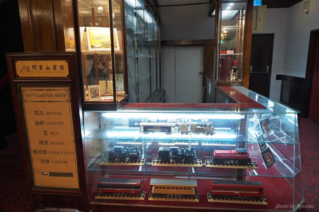 櫃檯旁邊展示登山鐵道模型及老唱片。