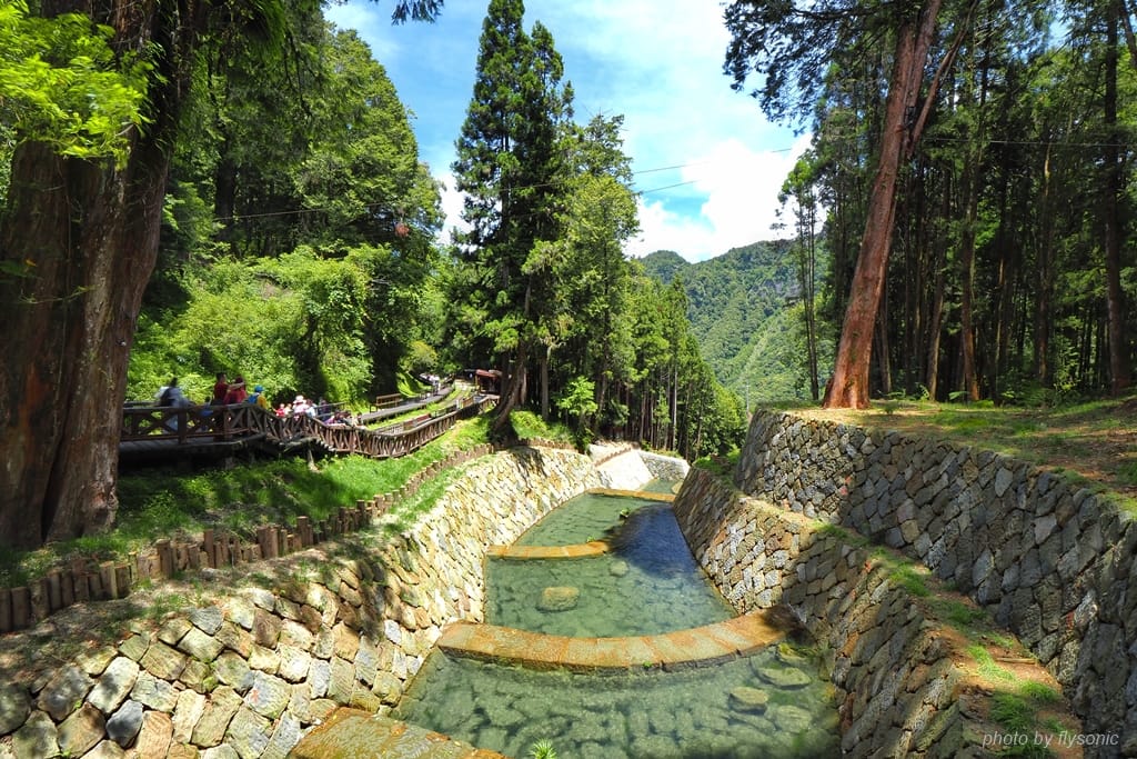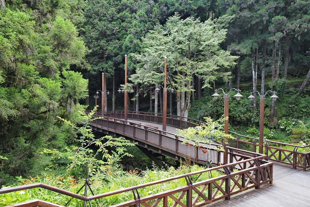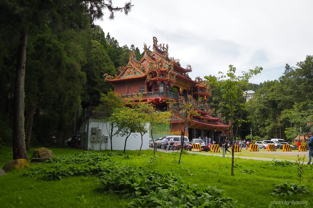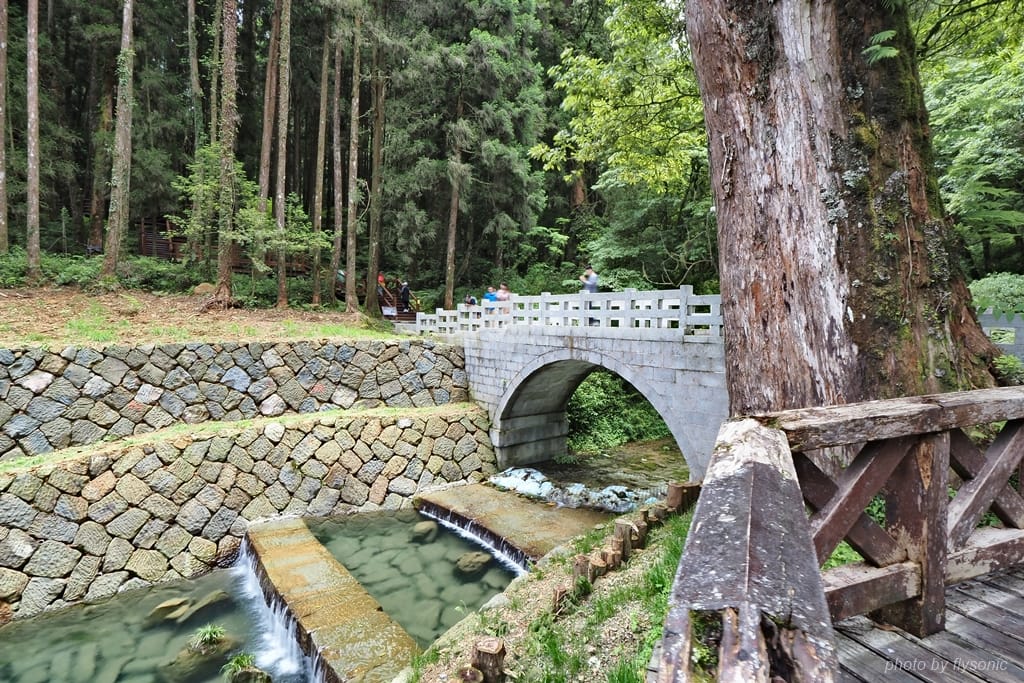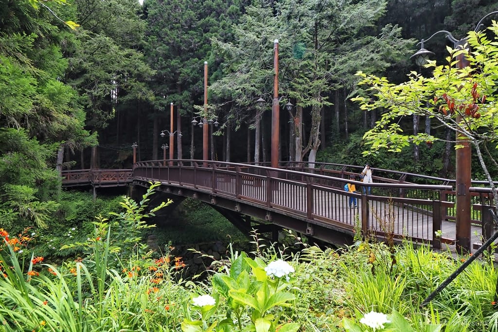 我們從阿里山賓館出發,先到「舟之橋」,在這裡可以遙望「香林拱橋」,往前走會到「受鎮宮」(香林服務區)。