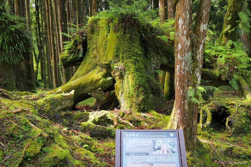 「金豬報喜」,也是一棵被砍掉的檜木頭,長相酷似一個豬頭。