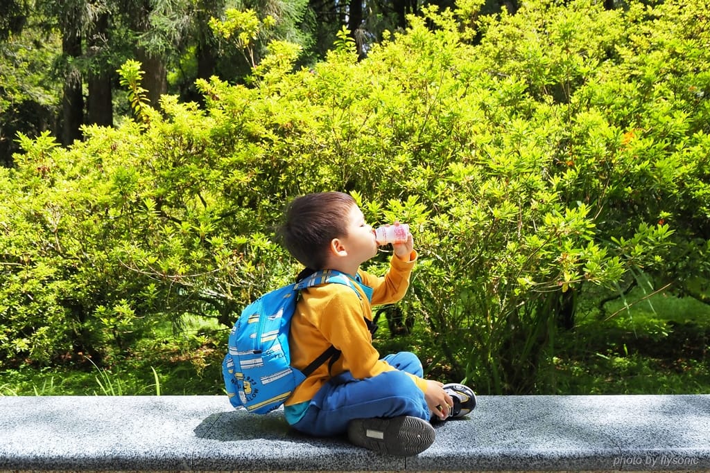 兒子走了這一大圈開始累了,我們就在旁邊的石椅上休息,一人一杯養樂多補充體力。